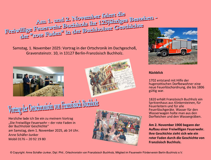 Die Chronik der Freiwilligen Feuerwehr ist Bestandteil der Ortschronik. Die Benutzungsordnung der Ortschronik von Französisch Buchholz kann ich Ihnen auf Anfrage gern zusenden.